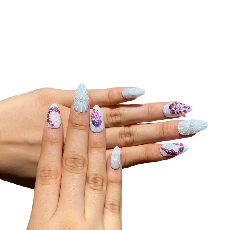 Mermaid energy, reborn. Light blue base with shifting chrome hues, jellyfish, waves, pearls — and serious aquatic slay.