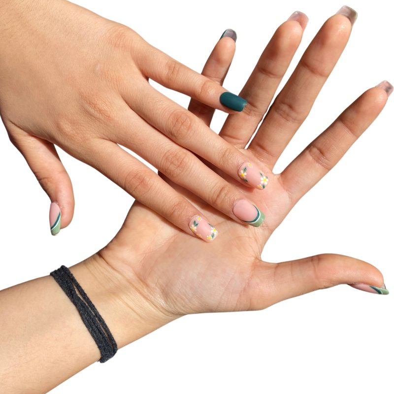 Matte greens and daisy florals — like a picnic on your fingertips.
