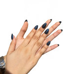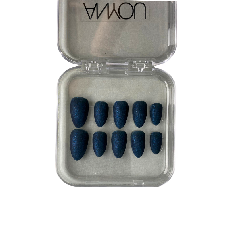 Category: 24k Glam Tags: dark blue matte nails, dark blue nails, matte nails, Midnight, short almond nails, velvet blue nails