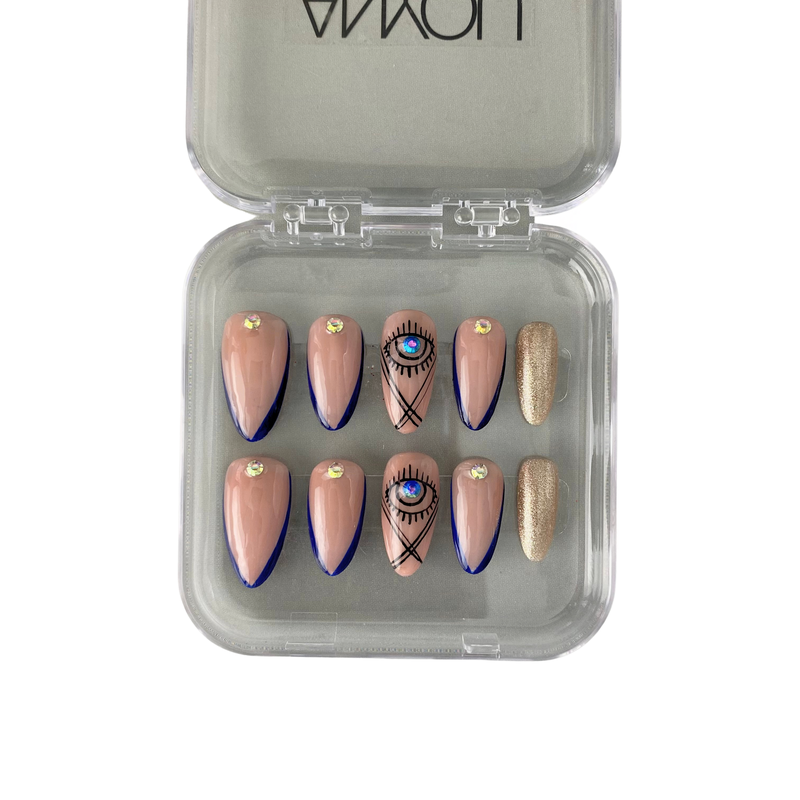 Evil eyes, deep blue French, and rhinestones. Protected and pretty.