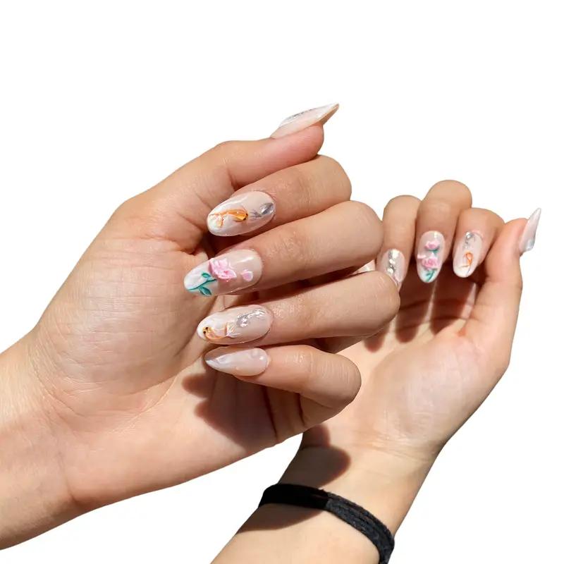 3D gold fish, whales, and flowers — it’s like your nails went scuba diving in couture.