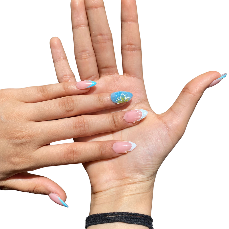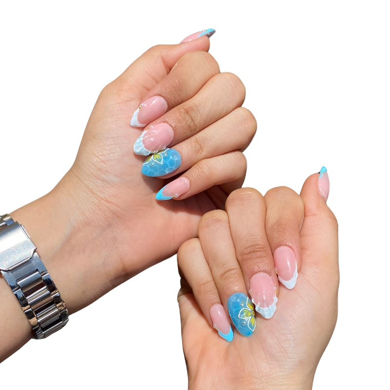 Tanned, toned, and tropi-cool. Blue base, sunny floral 3D art, and sea floor realness — vacay mode: activated.