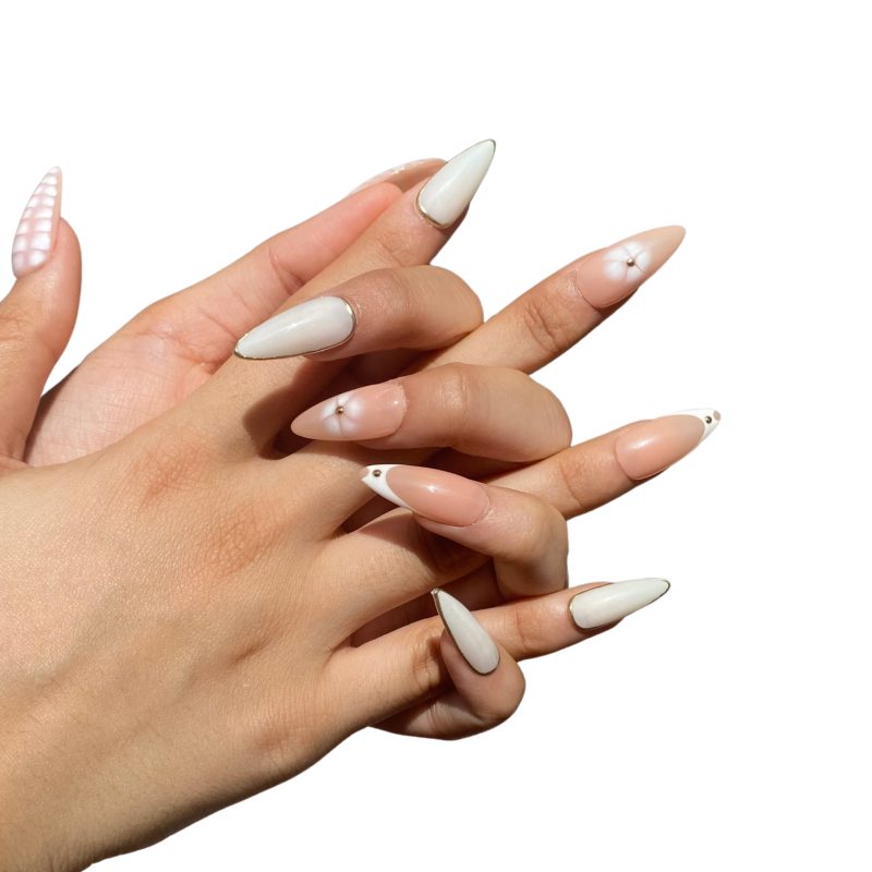 Where grace meets chaos — long nudes with a whisper of chrome and delicate white blossom art. You’re not complicated, you’re couture.